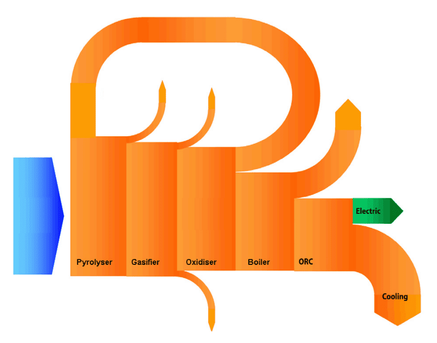 4. Panas sebagai sumber energi: Pirolisis memerlukan masukan panas untuk memulai dan mempertahankan proses. Panas yang dihasilkan selama proses pirolisis, termasuk reaksi eksotermik, dapat dipulihkan dan digunakan sebagai sumber energi. Mengintegrasikan pirolisis dengan Organic Rankine Cycle (ORC) memungkinkan konversi panas yang diperoleh kembali menjadi listrik.